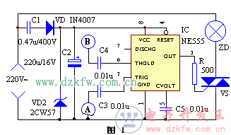 该装置电路见图1。当人手碰一下金属触片A,人体上的杂波信号便通过C3加到时基电路的②脚,②脚被触发,整个触发器翻转,③脚输出高电平,输出经限流电阻R加到可控硅控制极,可控硅VS导通,ZD点亮。