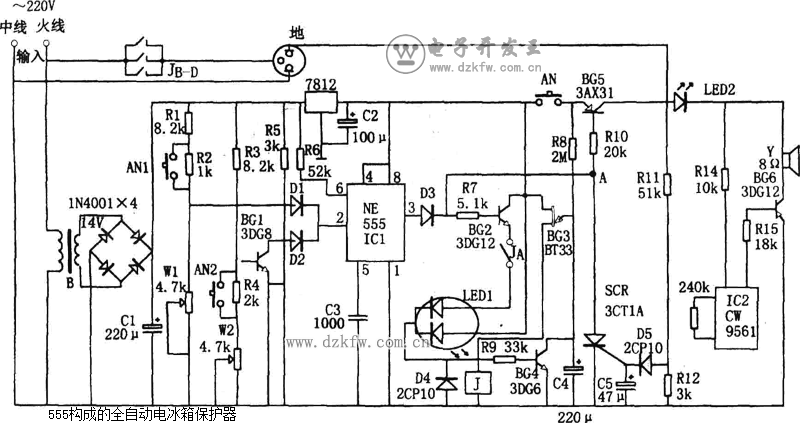 本保护器具有过压和欠压保护、断电延时、漏电自动断电、声光报警等多种功能,从而可避免对电冰箱造成意外的损伤。 NE555保护电路过压欠压冰箱保护电路
