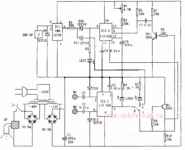如图所示为手触式定时供水控制阀电路。该控制阀由降压整流电路、双稳态触发电路IC2-1(1/2556)、定时电路IC2-2(1/2556)、继电器控制电路等组成。降压整流电路为IC1(IWH8778)、IC2(556)等提供直流电压VDD=+12V。当触摸金属片M2时,IC22-1和C2、C3、D12、D13组成的双稳态触发电路发生翻转,由⑤脚输出的高电平使BG2截止,BG1导通,且点亮LED2,从而又使单稳定时电路IC2-2翻转,定时时间为td=1.1(R3+Rw1)C6,由IC2-2⑨脚输出的高电平使IC1功率开关管导通,继电器J吸合,J1-1触点闭合,电磁阀DF通电开启、放水。定时时间到,IC1关闭,停止放水。当开关K拨到“2”位时,为人工放水状态,需要关闭时,触摸M2即停止放水。