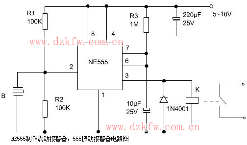 当被保护对象发生震动时,传感器B立即检测出来并送入NE555的2脚一串脉冲信号,其3脚输出电压直接驱动继电器K吸合,常开触点控制报警器工作。