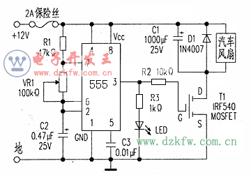 电位器VR1可以改变振荡器输出波形的占空比,从而改变风扇的转速。如果风扇转速的低速,高速范围太小,可以增加,减小C2(0.47μF)的值,来减少/增加风扇的转速。