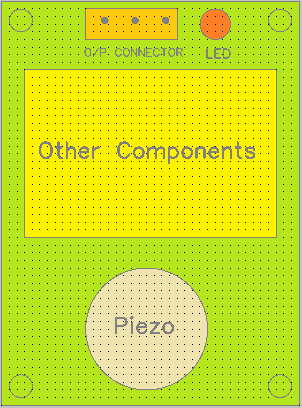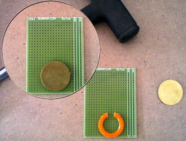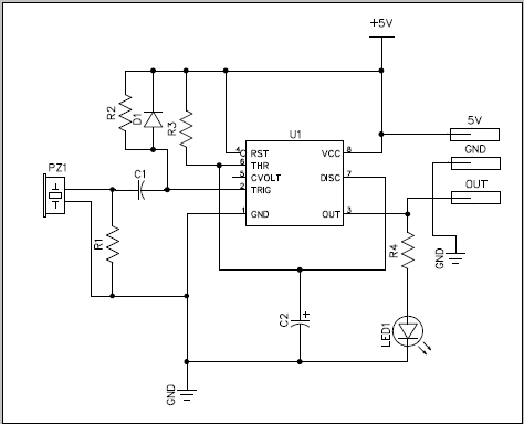 提出的电路板布局布线图。首先应用薄胶量到标记区域在PCB压塑料垫圈(合适的直径)成胶,放在一边,直到胶水是困难的。其次,应用在洗衣机上的胶点,使压电(与presoldered线)和焊接导线到电路板。决定你想发送你的线在你完成这一步。很难把线之后。现在你可以完成施工的焊接剩余的组件在电路图表示。施工后,轻轻敲打或压电传感器与你的fingertipor小锤测试电路。每一次的压电元件接收到,红色LED灯近一秒。请注意,压电元件很容易被损坏,所以很温和。