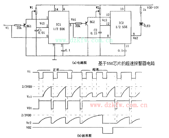 IC2单稳态触发器的工作与IC1类同,只是其受IC1的输出控制,且IC2的充电时间常数(1.1Rw2C2)大于Vo1在正常转速时输入脉冲的周期,故在正常转速时,C2上的充电电压低于2/3VDD,IC2输出高电平。当超速时,由于Vo1持续为高电平,故C2上的电压充到2/3VDD,相应使IC2翻转,发生复位,输出低电平。此时发光二极管发光,告知已超速,即报警。