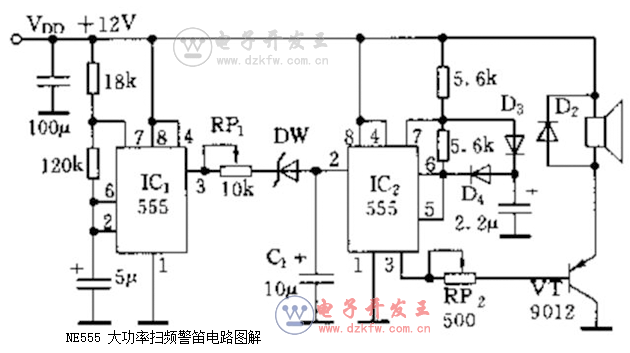 如图所示,电路由两个NE555组成,第一个多谐振荡器的振荡频率在5Hz左右,3脚输出的方波经电位器RP、DW加至IC的2脚,电容器C1上形成的三角波使IC2产生频率由高到低、又由低到高的扫频振荡,类似于警笛的效果。IC2的控制电压端5脚与阀值端6脚短接,更加强了警笛的音响效果,推动级视实际应用场合,决定是否采用大功率三极管和高音喇叭。