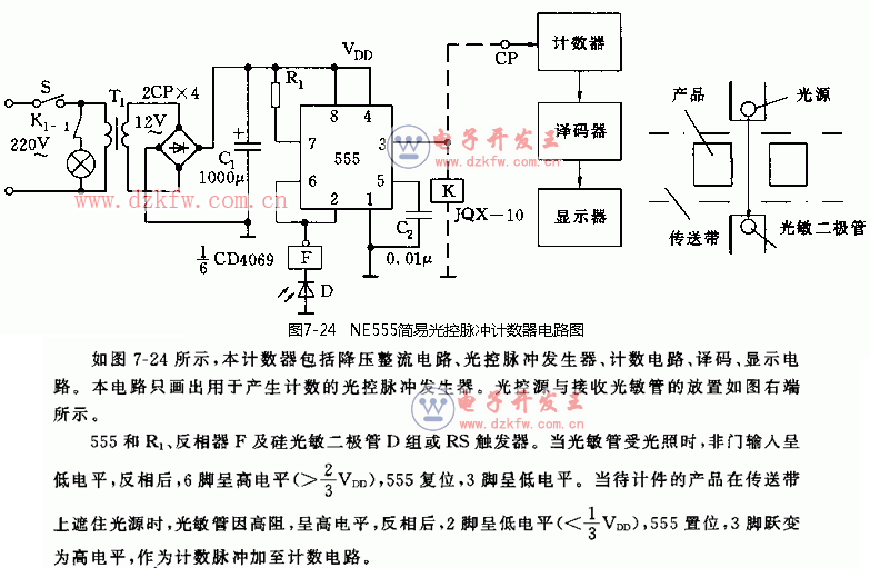 本计数器包括降压整流电路、光控脉冲发生器、计数电路、译码、显示电路。本电路只画出用于产生计数的光脉冲发生器,光控源与接收光敏管的放置如图右端所示。