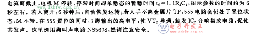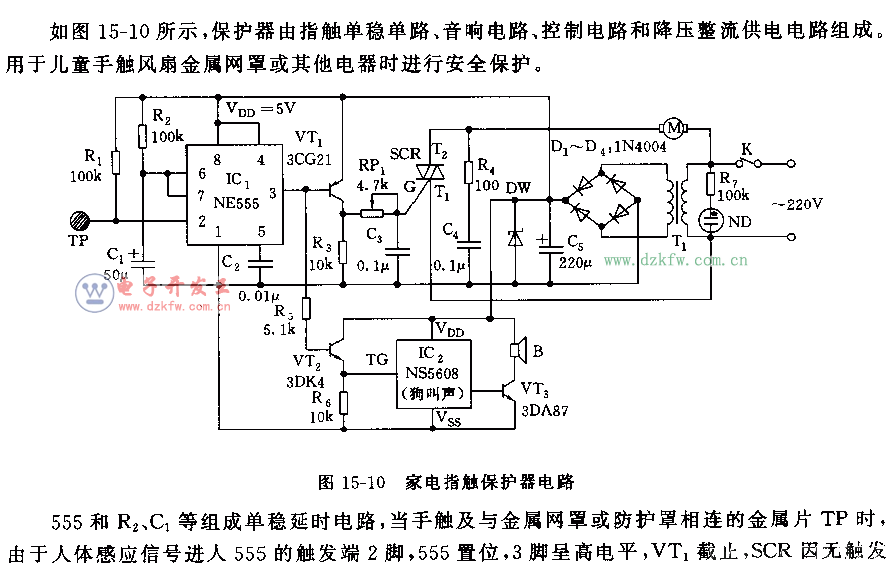 保护器由指触单稳电路、音响电路、控制电路、降压整流供电电路组成。用于儿童手触金属网罩或其他电器时进行安全保护。