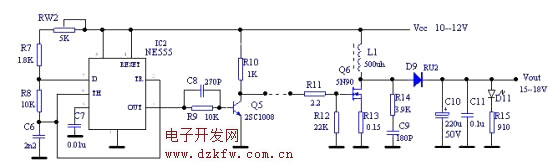 通过调节RW2,可以改变NE555的振荡周期,同时也改变了输出波形的占空比,从而改变L1的储能大小,最终改变了输出电压值。