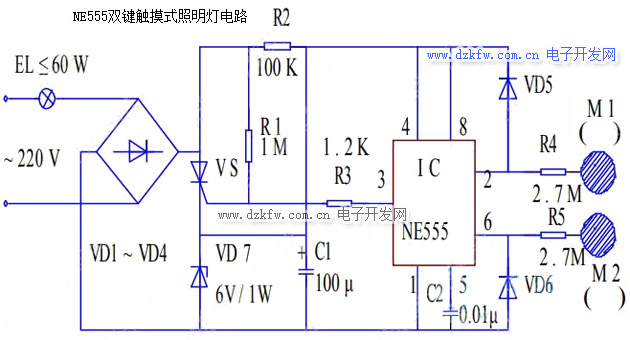 本电路图使用两个触摸电极片,分别代替在实际生活中的开和关控制。双触摸式照明开关电路如图1所示。VS与VD7构成了开关回路。当人触摸到M1(开)电极片时,人体通过R4、VD5整流后给ICNE555集成电路的2脚一个低电平信号(此时IC NE555集成电路接为RS触发器),输出脚3输出高电平,通过R3后触发VS的门极,VS导通,电灯点亮。当人触摸到M2(关)电极片时,人体通过R5、VD6整流后给ICNE555集成电路的6脚一个低电平信号,输出脚3输出低电平,R1提供的正向触发电压被R3通过集成电路的3脚对地短路,VS失去触发电压,当交流过零时即关断,电灯熄灭。