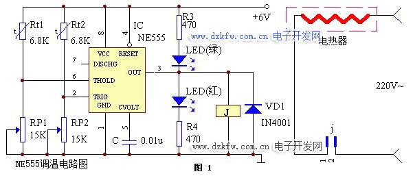 ne555调温电路图大全(二)恒温控制器由热敏电阻Rt1、Rt2、NE555时基电路、温度范围调整电阻RP1、RP2及控制执行机构组成,电路如图1所示(点此下载原理图)。Rt1、RP1为上限温度检测电阻,Rt2、RP2为下限温度检测电阻。当温度下降时,②脚电位低于1/3Vcc时,③脚输出高电平,J吸合,LED2点亮,开始加热。当温度升高而使IC⑥脚电位高于2/3Vcc时,③脚输出低电平,J释放,断开受控“电热器”的电源,停止加热。