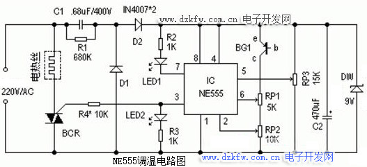 ne555调温电路图大全(三)电路如图所示。图中IC为NE555时基电路。RP3为温控调节电位器,其滑动臂电位决定IC的触发电位V2和阀电位Vf,且V5=Vf=2Vz。220V交流电压经C1、R1限流降压,D1、D2整流、C2滤波,DW稳压后,获得9V左右的电压供IC用。室温下接通电源,因已调V2Vz,V6≥Vf时,IC翻转,3脚变为低电平,BCR截止,电热丝停止发热,温度开始逐渐下降,BG1的ICEO随之逐渐减小,V2、V6降低。当V6元件选择: