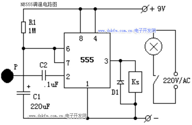 当需要开灯时,用手触碰一下金属片P,人体感应的杂波信号电压由C2加至555的触发端,使555的输出由低变成高电平,继电器KS吸合,电灯点亮。同时,555第7脚内部截止,电源便通过R1给C1充电,这就是定时的开始。