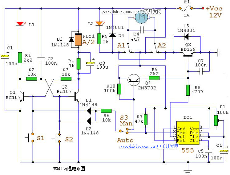 ne555调温电路图大全(五)电路使用晶体管,集成电路和一个继电器的混合物,并且用于自动地打开和关闭的一对帘。使用开关S3还允许手动控制,使窗帘,只留部分打开或关闭。该电路控制一个连接到一个简单的滑轮机构的马达,以移动窗帘。