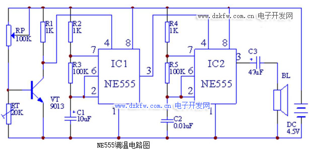 ne555调温电路图大全(六)水开报警器由温度控制电路、低频振荡电路和高频振荡电路等三部分组成。RP、RT和VT1组成温度控制电路。由IC1、R2、R3、C1组成的低频振荡电路,其强制复位端④脚受VT1控制。IC2、R4、R5、C2等组成的高频震荡器,其强制复位端④脚受IC1控制。当水温达到一定温度时,RT阻值变小,VT1截止,IC1④脚为高电平,IC1开始振荡,输出低频脉冲,调制IC2组成的高频振荡器工作,发出滴-滴声。
