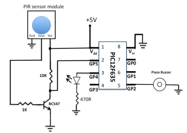 该红外报警器方案的电路图非常简单,这里使用4节AA电池为电路供电,可提供6V电源。串联使用一个二极管将电压降至5.4V,因为PIC单片机的工作电压应低于5.5V。此外,在电源极性相反的情况下,该二极管还可以为电路提供保护。我已经使用NI-MH可充电电池(可提供4.8V)对电路进行了测试,并且可以正常工作,但是我建议使用碱性电池(每个1.5V)以提高性能。你也可以使用9V电池,但是电路中需要LM7805稳压器IC。