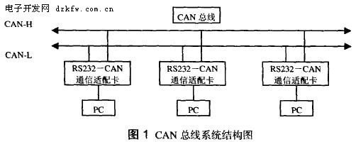 本实验通信网络通过CAN总线传输数据,设计的CAN-RS-232通信适配卡,可挂接在通信网络的任一节点位置,对于通过RS-232总线连入CAN网络的PC,可用WINDOWS自带的超级终端或者我们用VC编写的串口操作程序来接收和发送数据,可以实现点对点,及一点对多点的通信,实现CAN协议里的数据帧和远程请求帧的传送所谓远程请求帧就是接收端通过发送远程帧启动其资源节点传送它们各自的数据,板卡还可实现10位精度的A/D转换并将得到的数据通过CAN总线上传给上位机CAN总线系统结构如图1所示: