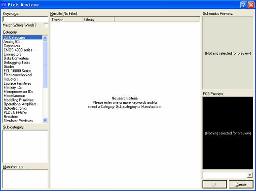 (components)”,单击“P”按钮会打开挑选元件对话框,选择了一个元件后(按了“OK”),该元件会在元件列表中显示,以后要用到该元件时,只需在元件列表中选择即可。