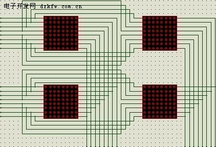 Proteus中只有5×7和8×8等LED点阵,并没有16×16LED点阵,而在实际应用中,要良好地显示一个汉字,则至少需要16×16点阵。下面我们就首先介绍使用8×8点阵构建16×16点阵的方法,并构建一块16×16LED点阵,用于本例的显示任务。