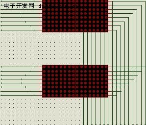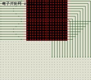 首先,从Proteus元件库中找到“MATRIX-8X8-RED”元器件,并将四块该元器件放入Proteus文档区编辑窗口中。此时需要注意,如果该元器件保持初始的位置(没有转动方向),我们要首先将其左转90°,使其水平放置,那么此时它的左面8个引脚是其行线,右边8个引脚是其列线(当然,如果你是将右转,则右边8个引脚是行线)。然后我们将四个元器件对应的行线和列线分别进行连接,使每一条行线引脚接一行16个LED,列线也相同。并注意要将行线和列线引出一定长度的引脚,以便下面我们使用。