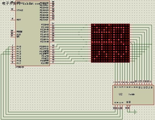 由于本例的软件程序需要首先注意硬件连接,所以,我们首先来看一下本例的电路图。电路图中用到了74159集成芯片,其功能是将4位输入译为16输出(低电平有效),刚好满足我们的要求。电路图中的其他元器件我们在以前的仿真实例中都已介绍过,此处不再赘述。最终完成的电路图如下所示: