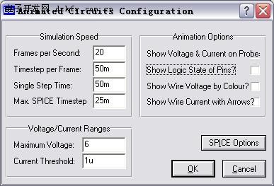 仿真中的一个画面如上面的电路图所示。也可能你的画面和上图中的不同,可能会有红绿小点闪烁,事实上那是Proteus中实时显示的电平信号。我们可以在“System”菜单下点击“Set Animation Options...”子菜单来打开“Animated Circuits Configuration”对话框,然后将“Animation Options”选项下面的“Show Logic State of Pins?”复选框去掉选中来改变设置。如下图所示: