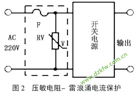 电网输电线受到雷击或感应雷时, 输电线中的感应突变电压会产生浪涌电流. 为防范雷浪涌电压和电流冲击, 常在电源的输入端并联一个或几个压敏电阻来释放雷浪涌电流的冲击. 图2 电路是用压敏电阻来防范雷浪涌电流, 压敏电阻Rv 常状态下呈高阻抗( 近似开路) , 当电网输电线遇到雷击或感应雷, 压敏电阻Rv 两端瞬间超过它的启动电压, 它将立即由高阻抗变为低阻抗( 近似短路) , 使雷浪涌电流释放, 同时交流保险丝F 熔断, 起到防输电线被雷击或感应雷而损坏电子设备的目的.