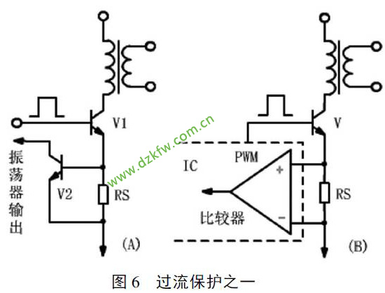 在互感器的耦合下, 若输出端有过载或短路情况发生时, 此时初级电流会很快的增加, 检测电阻RS( 锰铜丝) 上的电压VRS 就会增大. 在图6( A) 此电压VRS 超过V2 的B- E 导通电压,V2 导通, 由于V2 集电极接的是振荡电路的控制端, 使振荡电路的振荡减缓或停止振荡. 在图6( B)VRS 经电压比较器后输出一个控制信号到振荡电路, 调节振荡频率, 使输出电压降低, 减小负载电流, 达到保护的目的. 图6( B) 与图6(A) 的过流保护精度要高, 因( B) 电路设计了误差比较和误差放大电路.