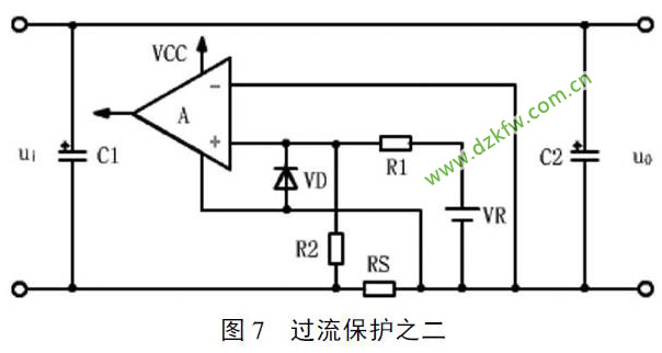 众所周知, 当电源输出端超过额定负载或短路或控制电路失去控制能力等意外情况时, 会造成电子设备不能正常工作或对电子设备造成损坏等. 过流保护电路有断路法、振荡器调频法.