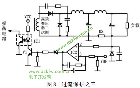 图8 是常见的光电耦合器驱动过流保护电路,其工作原理: 当输出电流过大时, RS 两端电压上升,IC2② 脚电压高于③脚基准电压, IC2 输出高电压,V1 导通, 光电耦合器IC1 发生光电效应, 使振荡电路的振荡频率发生变化, 从而控制开关管的脉冲信号的宽度( 或频率) 发生变化, 使得输出电压降低, 达到输出过载限流的目的.