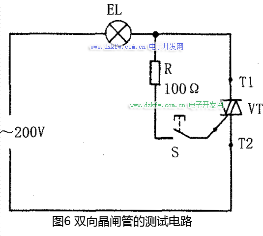 图6是双向晶闸管的测试电路。电路中,FL为60 W/220 V白炽灯泡,VT为被测双向晶闸管,R为100Ω限流电阻,S为按钮。