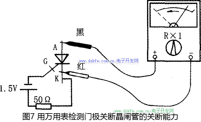 态,说明其触发能力正常。再在晶闸管的门极G与阳极A之间加上反向触发信号,若此时A极与K极间电阻值由低阻值变为无穷大,则说明晶闸管的关断能力正常,图7是关断能力的检测示意图。