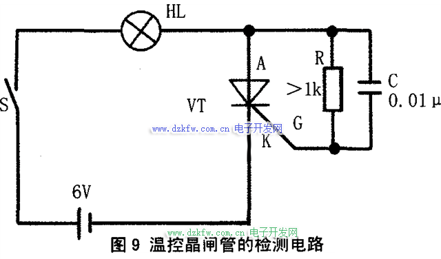 图9是温控晶闸管的测试电路。电路中,R是分流 电阻,用来设定晶闸管VT的开关温度,其阻值越小,开 关温度设置值就越高。c为抗干扰电容,可防止晶闸管 vT误触发。HL为6.3 v指示灯(小电珠),S为电源开关。