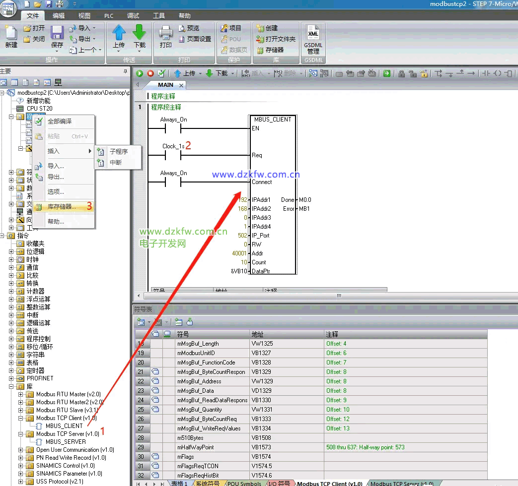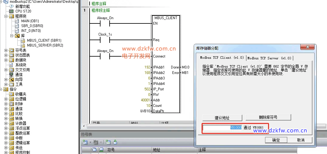 提醒一下:与MODBUS RTU相比,这儿没有了速率、校验等问题,但是也要设置好对方的IP地址、端口(一般是502)、信息所在的地址区,以及读回来的数据存储位置(这是VB10开始的20个字节,因为40001的单位是两字节的字)。