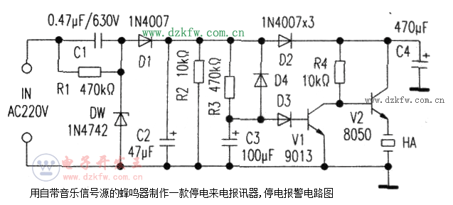 用自带音乐信号源的蜂鸣器制作一款停电来电报讯器,停电报警电路图