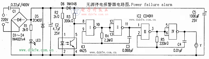 现在绝大多数学校都装有自动打铃装置.但在电网突然停电后,往往要采取人工打铃或启动自备发电机.以保证学校正常作息时间不受影响。这里介绍的停电报警器不需要配备电池,当电网停电时,它能利用本身大电解电容所储存的电能让报警器发出持续约5分钟急促的“嘟-嘟-”报警声,以通知相关工作人员准备人工打铃或启动备用电源。该无源停电报警器电路如附图所示。图中IC2(CD4011)为2输入端四与非门CMOS集成电路,它的I~Ⅳ四个单元组成两个频率不等的振荡器(I、Ⅱ单元、R4、C3组成一个,Ⅲ、Ⅳ单元、R5、C4组成另一个)。在电源输入端接上220V市电后.市电经C1限流,D1~D4整流,C2滤波,D5稳压后,在C2两端输出15V左右的直流电。它被分成三路.一路经R1使红色发光二极管LED发光,表示电网供电正常。另一路经R2加至光电耦合器Ic1(4N25)的①脚,使光电耦合器内藏的发光二极管发光,内藏的光敏三极管导通.内阻减小,使Ic2的I单元的输入端⑧脚为低电平,振荡器停振.压电陶瓷片无声。第三路是经D6向C5充电,使C5充上约15v直流电,作为电网停电后该报警器的电源。一旦市电停电,C2储存的电荷将通过R1和LED泄放,并很快泄放完毕.这时有电指示灯LED熄灭.表示市电停电。与此同时。IC1内藏的发光二极管也随之熄灭,内部的光敏三极管由导通变为截止,IC2的⑧脚为高电平。于是IC2和相关元件组成的两个振荡器起振,压电陶瓷片Y就会发出“嘟-嘟-”的报警声,此时由于D6截止,C5储存电荷不会送到D6左边电路中去,加之IC2为CMOS电路,耗电极省,故C5储存的电能足可维持陶瓷片发声5分钟之久。若觉时间不长,加大C5容量,还可以延长Y的发声时间。当电网恢复供电时.LED又会点亮,IC2⑧脚输人低电平,振荡器停振,压电陶瓷片停止发声.C5又被充满电荷,以备下次停电作为电源使用。