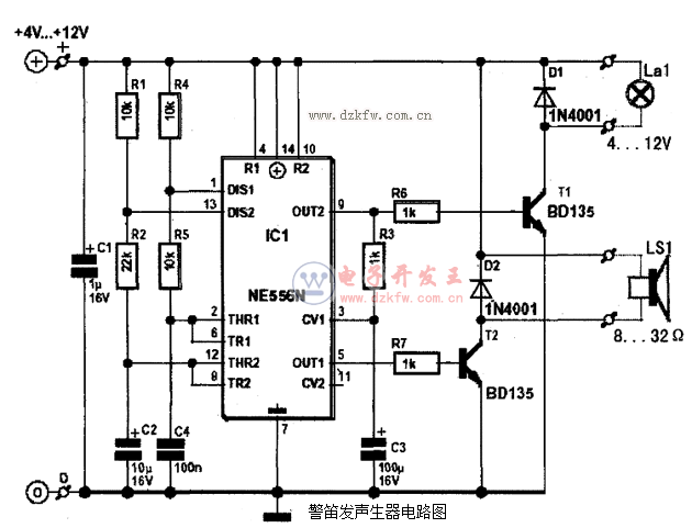 这是一款极其简单的电路,可以产生类似于美国警车发出的警笛声音,在发出警报声的同时警灯将同步闪烁。这个电路可以提供大于1A的负载,可驱动几盏灯或大功率扩音器,这个电路将产生相当大的声音和光亮。
