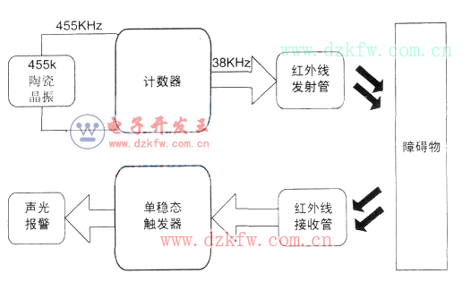 发射出的红外线如遇障碍物,则反射回来,被红外一体化接收头接收到,接收头输出触发信号,触发单稳态触发器工作,驱动LED及发声装置进行声光报警。