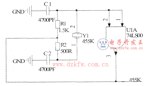 利用455K陶瓷晶体振荡器搭接多谐振荡器,产生455Khz脉冲信号,U1选用74LS00集成芯片。具体电路及参数如下图。