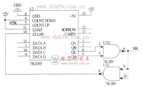 要得到38Khz信号,需要对455KHz信号进行12分频,电路如下图所示,计数芯片选用74LS193。