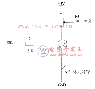 采用一个三极管S9013驱动红外发射管,R4为可调电阻,用于调整发射功率,从而达到调整红外发射距离的目的。电路如下图所示。