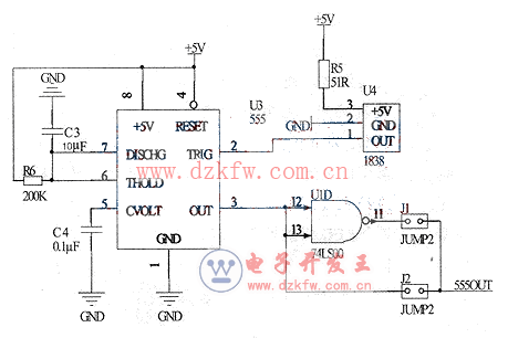 接收采用红外一体化接收头TL1838,使用非常简单,如下图.接收到红外线时,1脚输出低电平,否则,输出高电平。利用555芯片实现单稳态触发器电路,低电平触发,当接收到红外线时触发器被触发,由555定时器的3脚输出高电平,高电平的维持时间根据t=l.lRC来计算,本电路中R=R6=200K,C=C3=10uF,计算得t=2.2S,也就是报警时间为2.2秒,通过调整R6和C3,可改变报警时间的长度。