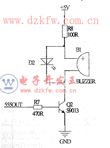 如下图所示.三极管Q2基极输入高电平时,管子饱和导通,驱动蜂鸣器B1及发光二极管D2进行声光报警。