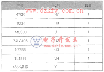 为降低成本,设计中未采用单片机进行控制,利用455K陶瓷晶振搭建振荡电路,产生455KHz脉冲信号,经计数器12分频,得到38KHz信号,驱动红外发射管发射红外线。