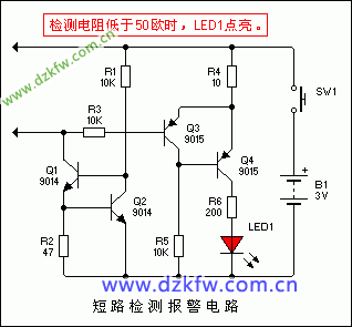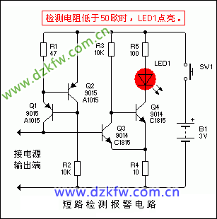 想做一个短路检测报警电路:想做一个指示短路的电路来指示电路板各个电源对GND的阻值是否异常:当短路(电源对地阻值小于50欧姆)时,红色指示灯亮;其余情况灯不亮。手头上有一些常用的二极管三极管,3V锂电池