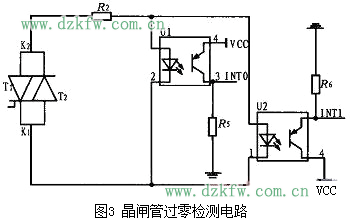 晶闸管投入电容器的时刻,也就是晶闸管开通的时刻,必须是电源电压与电容器残压的幅值和相位相同的时刻。因为根据电容器的特性,当加在电容上的电压有阶跃变化时,将产生冲击电流,会损坏晶闸管且给所在电力系统带来高频振荡等不利影响。所以设计了晶闸管过零检测电路来解决残压测量的难题。晶闸管过零检测电路如图3所示。