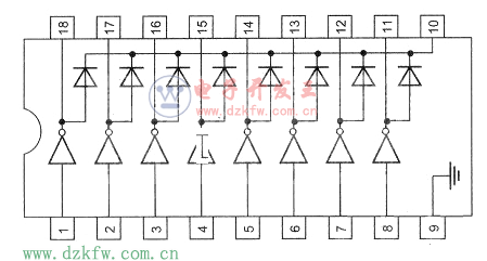 由于经数字门电路输出的步序信号还无法直接驱动电机工作,故还需增加一级功率放大做为整个控制电路的输出。由于通常电子小制作中使用的步进电机功率较小,故本电路选用的是达林顿电流驱动器ULN2803模块作为控制器的功率输出电路,ULN2803的引脚如下图所示,其中:1-8脚为输入端;11-18脚为输出端;9脚接地;10脚接电源“+”。由于ULN2803的扇出电流有限,而灌电流较大,能达到1A左右,所以本电路使用其灌电流工作方式,ULN2803内部的续流二极管也保证了其与电机线圈连接的安全。如果需要输出的电流能再大一些,也可以将ULN2803的二组并联,作为一组使用即可。