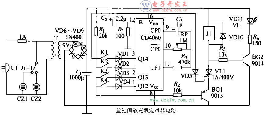 (3)鱼缸间歇充氧定时器电路如图3-33所示。