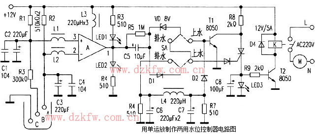 开关SA置于右端上水挡位。接通直流12V,当水位低于低水位B时,运放LM358A同相、反相输入端③、②脚电压相等,其输出端①脚无输出,12V电压经P3、P4同时点亮LED1、LED2,①脚将有6V的电压,经R5、C5耦合至VT控制极,使VT导通,LED3点亮,T2导通,继电器K吸合,水泵工作。当水位等于或者高于低水位B时,运放LM358A同相输入端③脚电压低于反相输入端②脚电压,①脚输出零电位,LED2熄灭,LED1保持发光。由于D1、D2的双层阻断,VT控制极电位不会被下拉,VT继续保持导通,水泵继续工作。当水位上升至高水位A时,LM358A同相输入电压高于反相输入电压,①脚输出高电平,LED1熄灭,LED2点亮,经R5、C5耦合,通过8V稳压管VD至T1基极,T1导通,VT断开,T2截止,水泵停止工作。当水位下降至A以下时,运放输出端为零电平,水泵仍停止工作,当水位下降至低水位B以下时,新一轮上水开始。