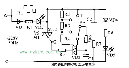 可控硅做的电炉功率调节电路图如下图所示。调节单刀四掷开关SA的档位,可以改变电容C1的充放电速率。利用C1两端交流电压通过双向触发二极管VD3去触发双向晶闸管VS导通、并改变了VS的导通角,使负载RL两端交流电压随之发生变化。