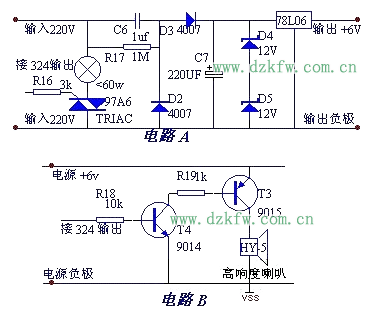 T1使用超高频管9018,f 大于700MHz。天线用直径1.5mm的漆包线外面套上绝缘套管,并弯成直径90mm的圆环。四个运放选用一块 LM324即可。“电路A”中C6要选耐压大于400V的无极性电容,双向可控硅用电流1A的97A6。三端稳压用78L06,其它元件无特殊要求。