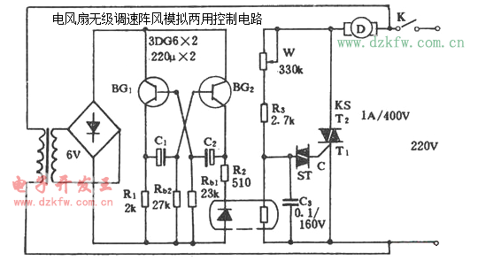 电风扇无级调速阵风模拟两用控制电路,该电路使用分立元件制作,构造简单。